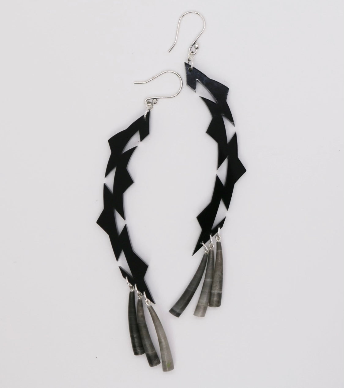 Curved friendship design (black acrylic pieces), old dentalium, all sterling silver findings and hooks.